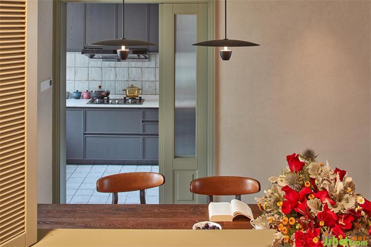 西班牙復(fù)古材質(zhì)的墻地磚,深圳家居設(shè)計搭配灰色的櫥柜簡單耐看,業(yè)主擯棄了繁瑣的掛件,把所有物品都完美的收納在櫥柜內(nèi)部。