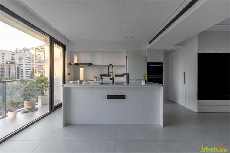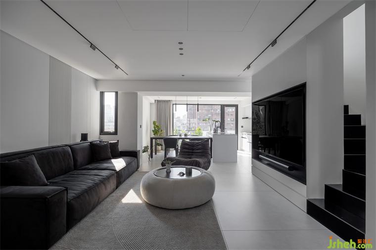“延續(xù)玄關調性,客廳在一片純白之上,置入黑色塊體,做為居宅中心,亦平衡視覺重量?!?