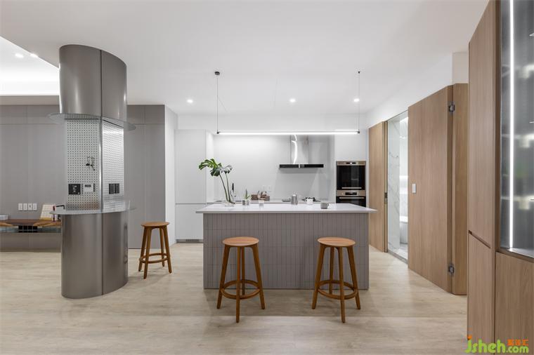 相對于客餐廳的留空處理,廚房機能相對完善,住宅設計以因應各種情境需求,不論是做為住宅、招待所亦或拍片場景,都能詮釋空間的使用彈性。在此我們也做了大片留白,僅以鋸齒狀立體磚呈現(xiàn)變化,冰箱及家電設備采取嵌入式設定,紅酒柜亦埋入中島,以保有整體視覺的利落齊整。