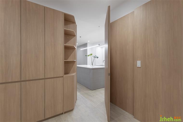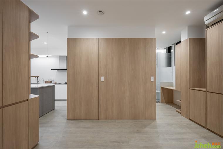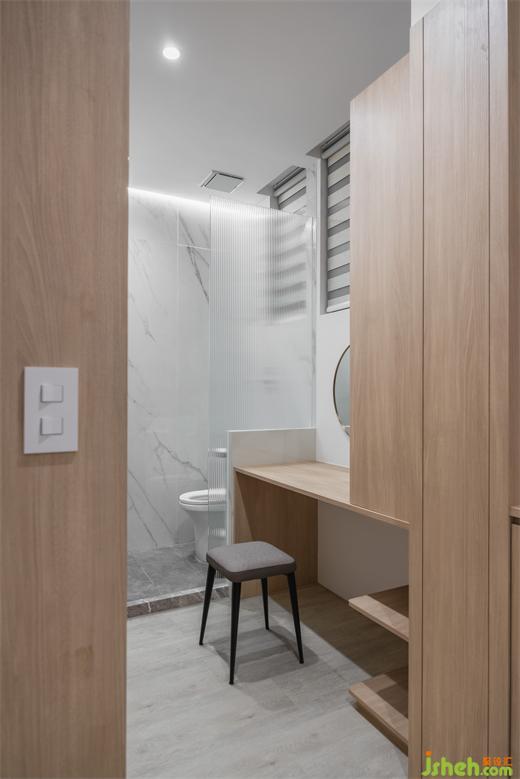 因衛(wèi)浴位置為固定不可移動,因此我們爭取主臥空間向外推,并賦予大量收納機能,定義空間量體,水平與垂直線條連貫對應,建立視覺秩序。另劃設簡易化妝臺與小便間,供影片拍攝或休憩使用,平時門片為敞開式,整面木質(zhì)語匯和公領域空間相互串連,隔而不分、界而未界。