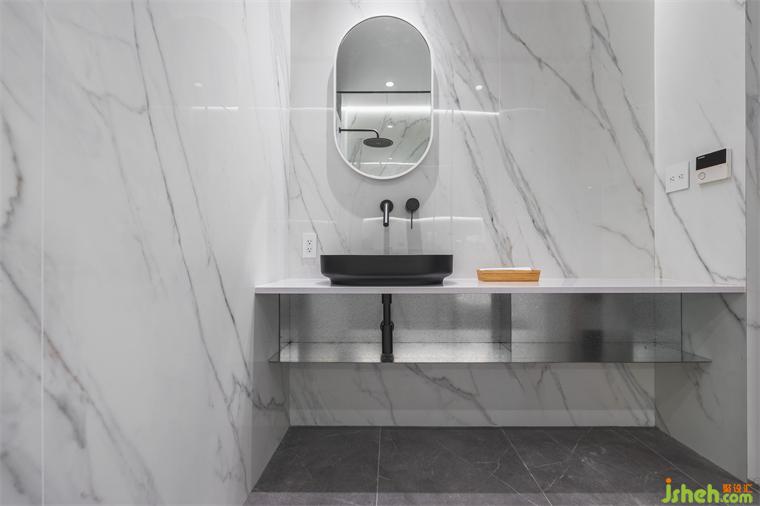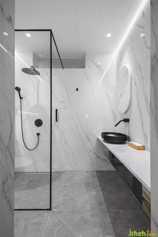 因應公私領域大面積的金質(zhì)與木質(zhì)調(diào),業(yè)主希望局部區(qū)域能采用清淺石紋,于是我們在衛(wèi)浴濕區(qū)及主臥廁所、小便間,都選用大理石紋呈現(xiàn),住宅設計立面則鋪以防水性能良好的晶石板材,同時屬零醛添加的綠色材料,兼顧安全、環(huán)保與實惠效益。