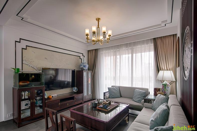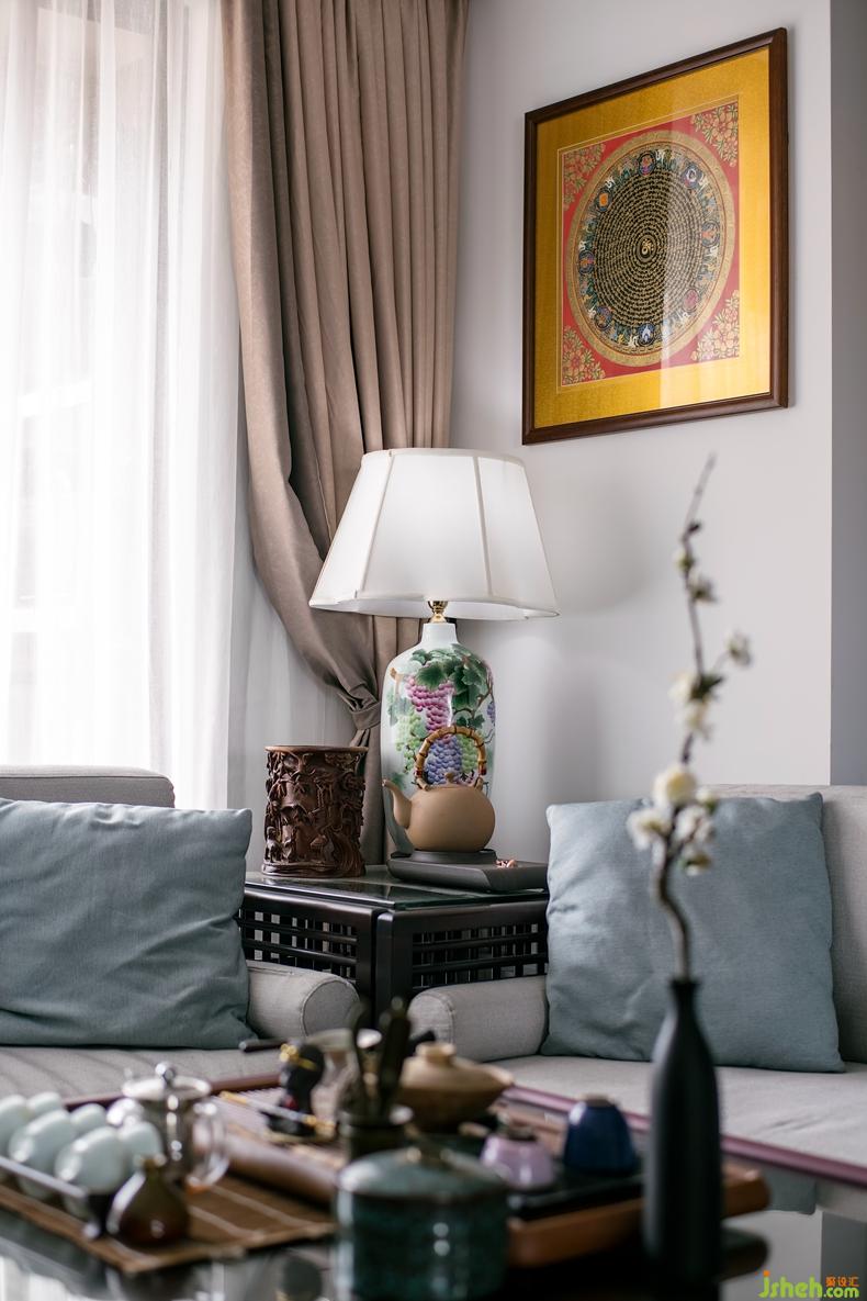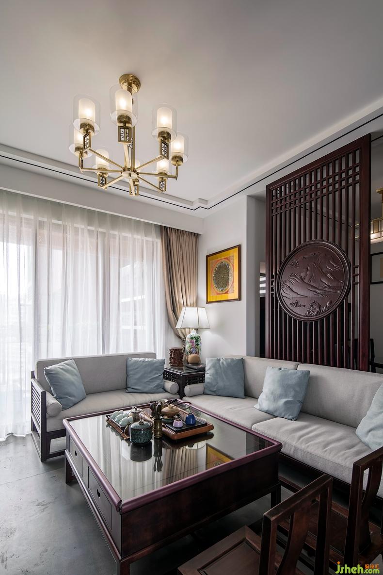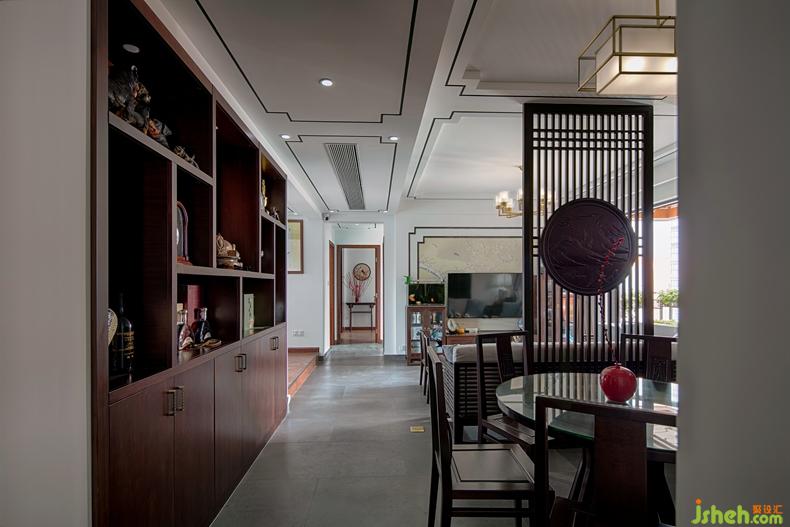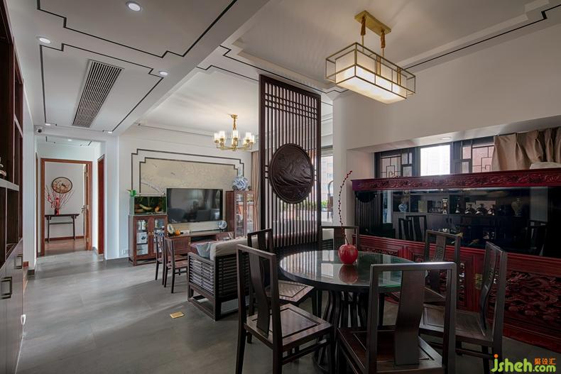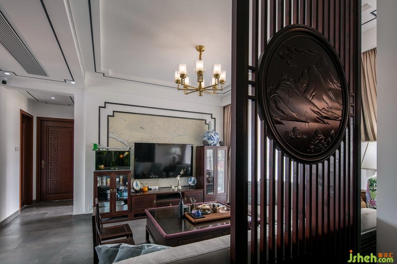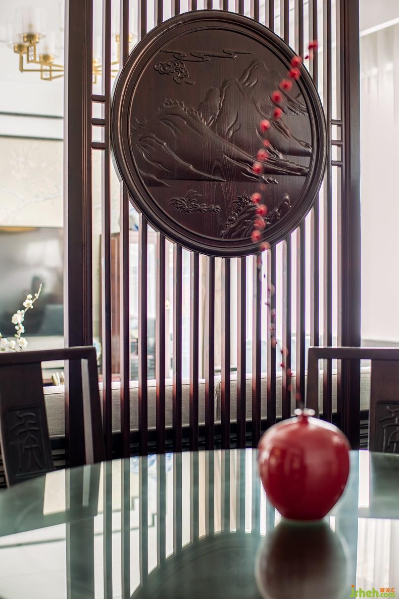 沙發(fā)背靠的地方做了一扇中式屏風(fēng),目的就是為了能為其提供“靠山”,并且與餐廳做一個區(qū)分,巧妙的選用屏風(fēng)起到隔而不斷的設(shè)計手法,既不影響空間的通透性,又能營造效果。呼應(yīng)整個設(shè)計理念。
