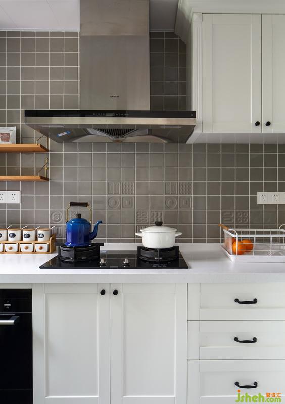 灰色的藝術(shù)磚,原木色的隔板,亮色的廚具點(diǎn)綴其間,置身其中,讓下廚也充滿(mǎn)了樂(lè)趣。