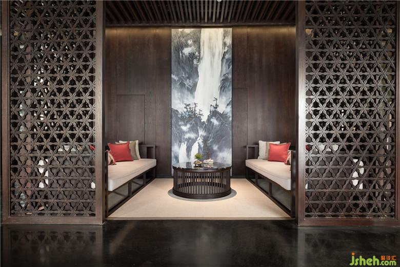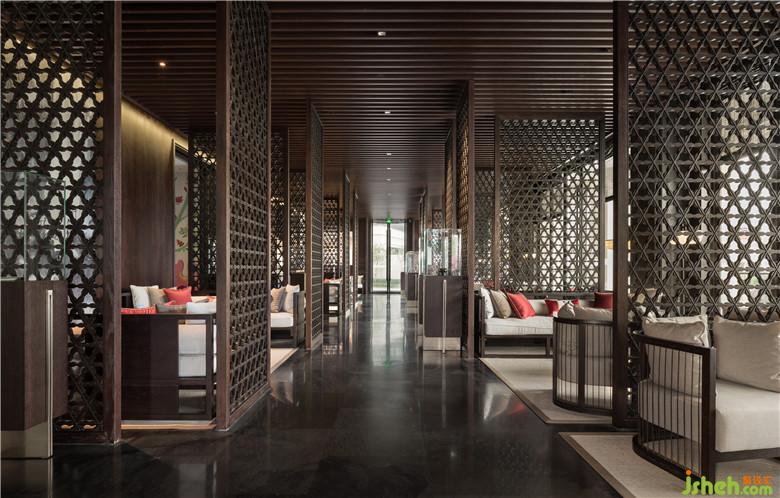 銷售中心提取中式傳統(tǒng)元素“木花格”,結(jié)合當(dāng)代建筑形態(tài),將深褐色的“木花格”拼接成大小不一的屏風(fēng)、圍欄等作為空間隔斷,營造出通透開放的大格局,統(tǒng)一了恢弘雅致的整體基調(diào)。裝修公司