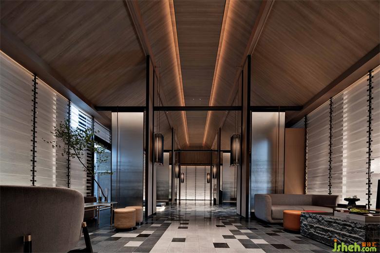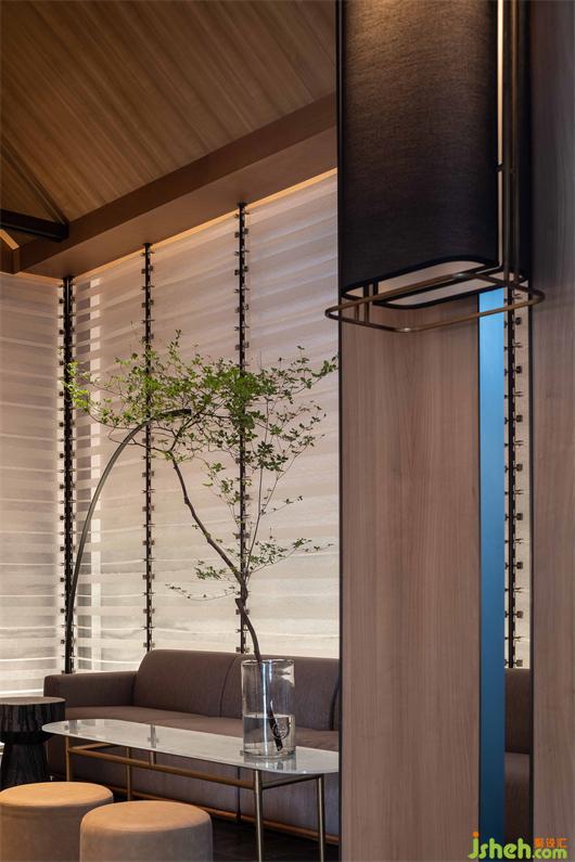 大堂的半透明屏風(fēng)又如山中水汽凝結(jié)成霧,將主入口和換鞋區(qū)遮擋開來,屏風(fēng)肌理隱約如青苔又似遠(yuǎn)山闊河,迷迷蒙蒙。整個大堂從下至上有一種“水以生木,水以養(yǎng)木”的格局。