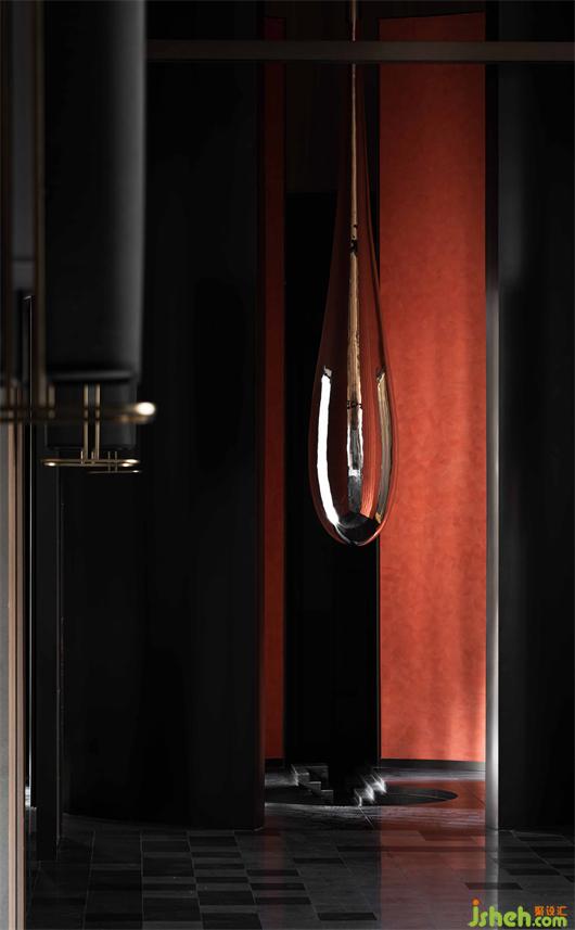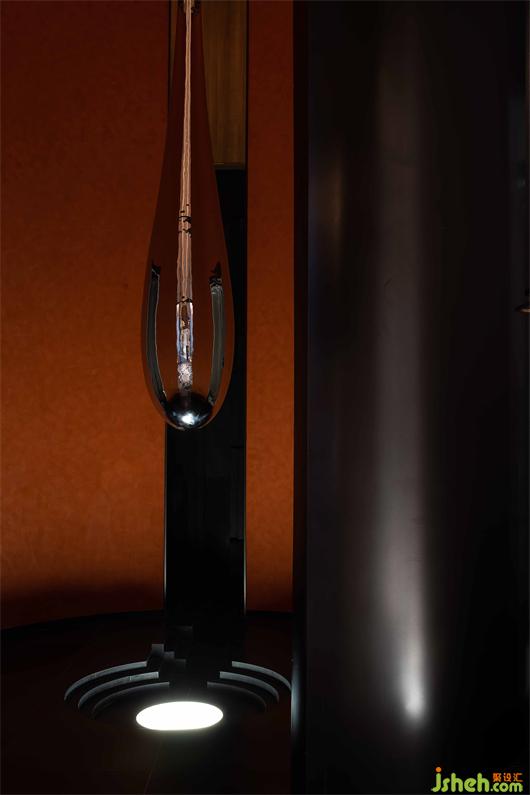 “秋荷一滴露,清夜墜玄天。”大堂一端水滴狀藝術(shù)雕塑品垂直落下,底部三層下沉石階如一汪清潭蕩漾開去,含承接之意,“潭”中的燈光似潭里水源,給空間一汪“泉眼”,與滴露生生相惜,復(fù)本溯源。整個雕塑呈現(xiàn)出會館與“水”的深層聯(lián)結(jié),承載著創(chuàng)始人與設(shè)計師對自然的珍惜和敬畏之情。