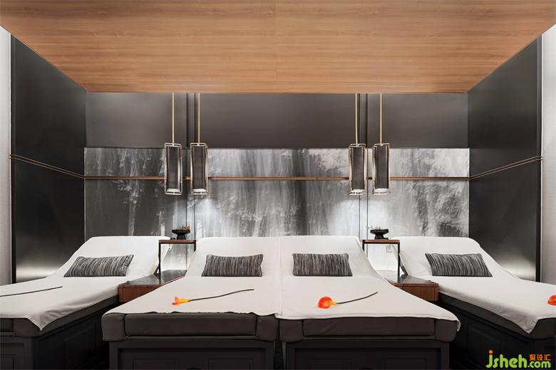 和子養(yǎng)生會館與“水”息息相關(guān),園中不乏水澤,但室內(nèi)并非處處有水。于是設(shè)計師便于無水之處生“水”,通過帶紋理的亞克力“引來”水之澄透和波紋。層層的磨砂亞克力平行排于立面,似一片河澤漣漪。燈上的波紋則似空山新雨,落在燈罩上凝結(jié)成珠,久久不肯散去。頗有“看山有色,聽水無聲”的意思。