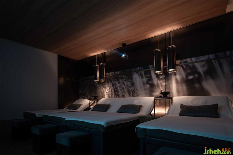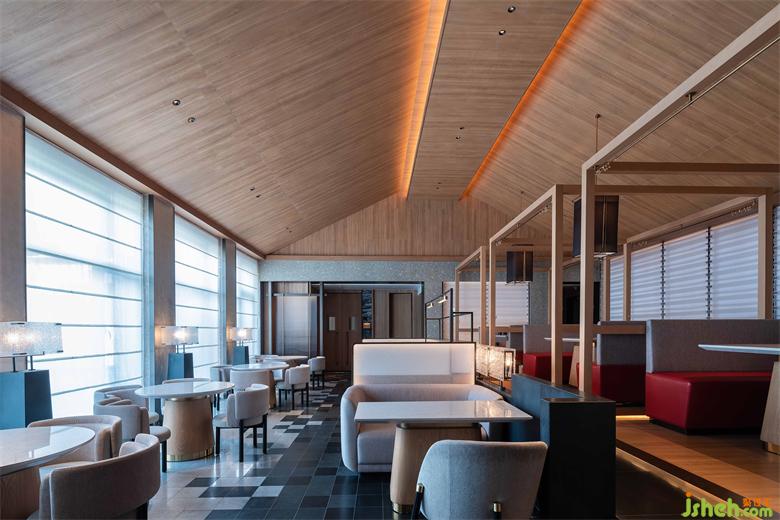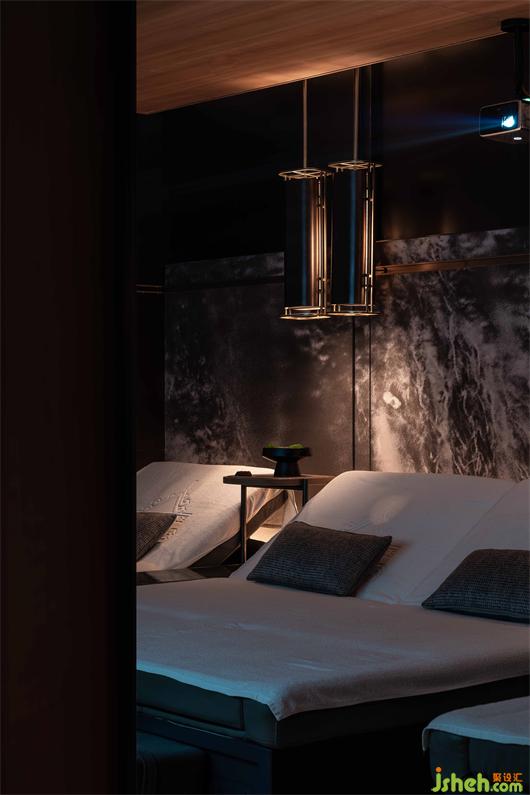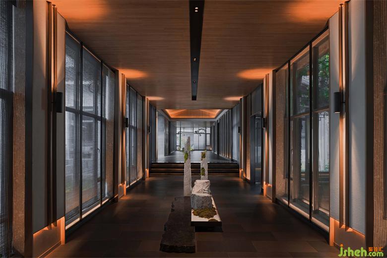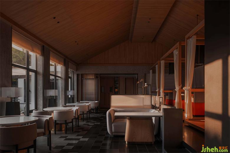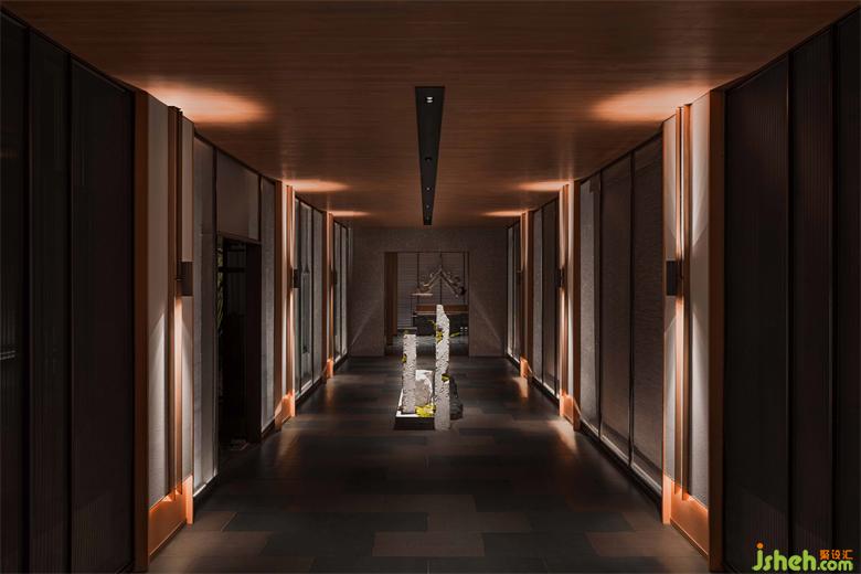 懸山頂?shù)奈蓓敱缓?jiǎn)化,只保留了正脊和垂脊的線條碰撞在一起,呈現(xiàn)出幾何本質(zhì)的美。會(huì)館設(shè)計(jì)夜間以光作導(dǎo)引,簡(jiǎn)約亦不失風(fēng)骨。不同的垂脊給室內(nèi)增添了不一樣的韻味,或曠達(dá)抒意,或典雅溫潤(rùn)。設(shè)計(jì)師用大面積色塊在空間進(jìn)行分割,使得其簡(jiǎn)約但不簡(jiǎn)陋,大氣規(guī)整。