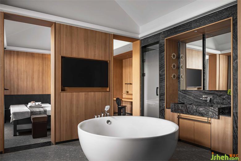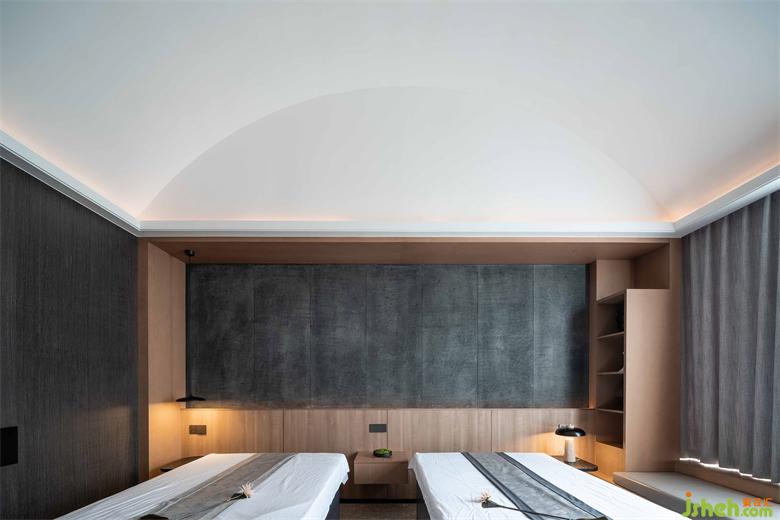 2人SPA包廂帶島型獨立浴缸,梳洗空間與按摩休息室以木門半隔,邊界模糊。會館設(shè)計懸山頂?shù)奈蓓斣诖碎g露出,極大地減少了島型浴缸帶來的曖昧感,卻留出十足放逸。按摩床所在的休息室落回寧靜收斂之氣,2人間也因屋頂之高不顯局促,從頂部垂下的燈盞給空間增加了纖細(xì)穩(wěn)定之美。