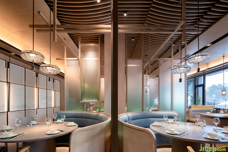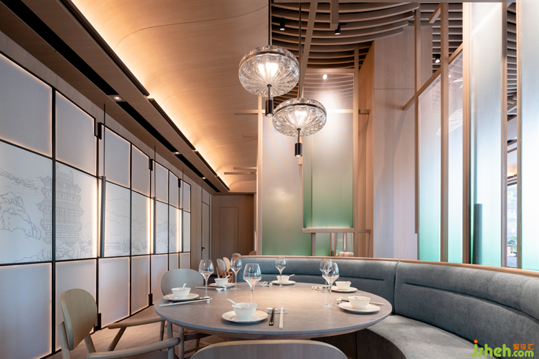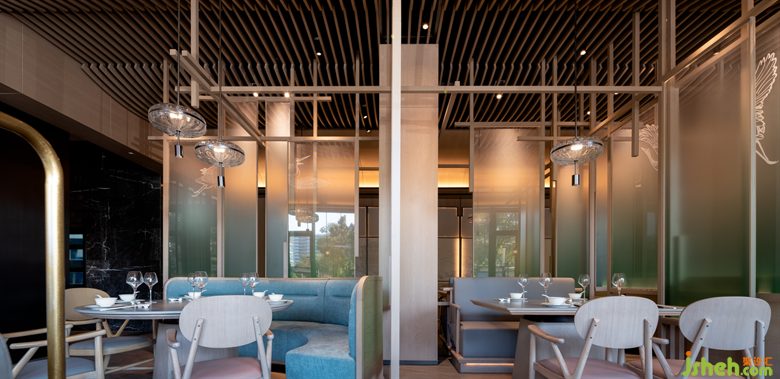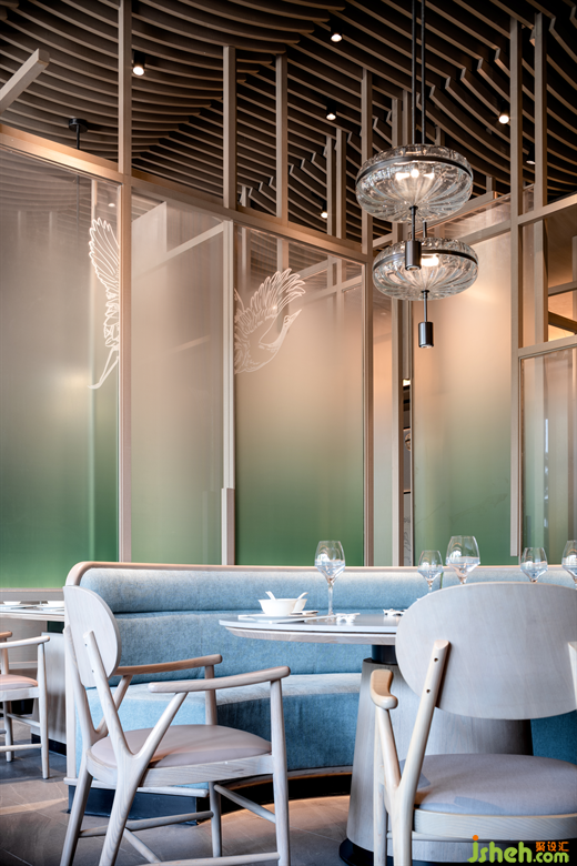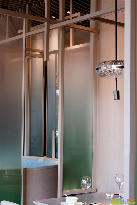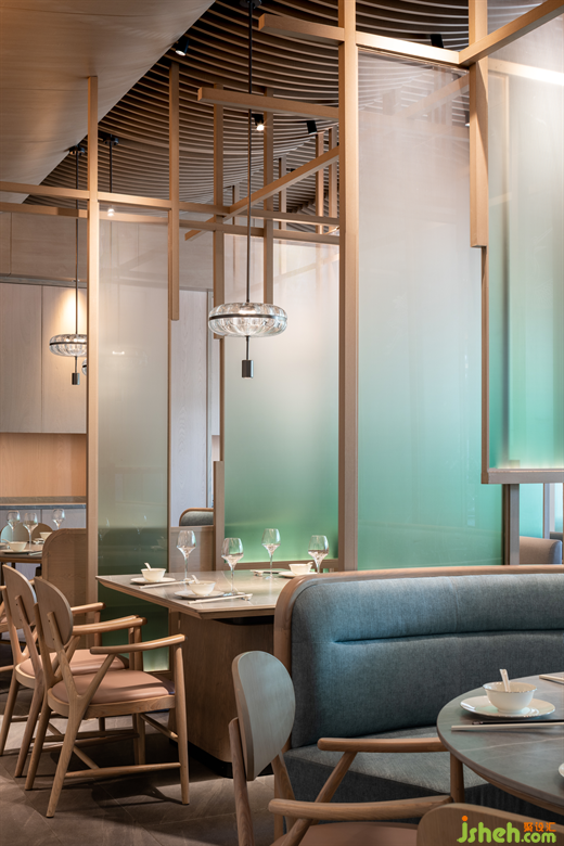 在來鶴臺廣場的滋奇臻品,餐廳設(shè)計師以木作框,以青色亞克力為隔斷,營造出透紗格柵的質(zhì)感,令光的滲入更具層次性的美感。空間的內(nèi)飾凝聚著濃郁的傳統(tǒng)人文精神元素,呈現(xiàn)詩雅韻律。