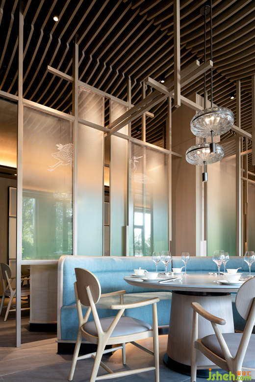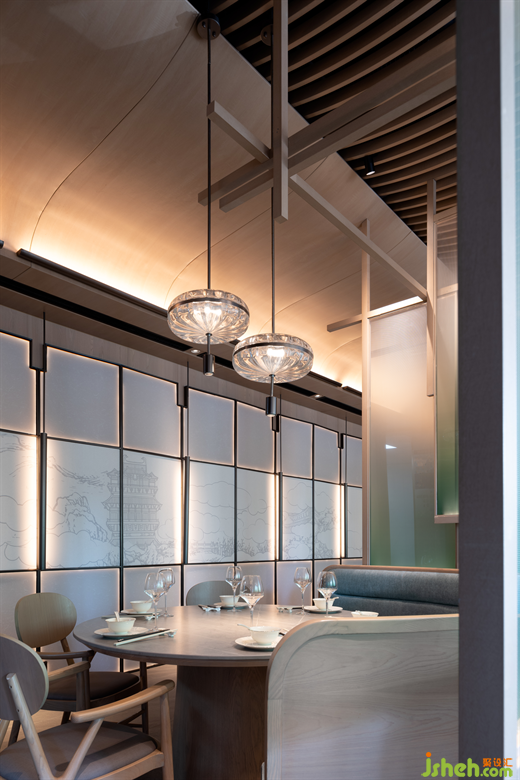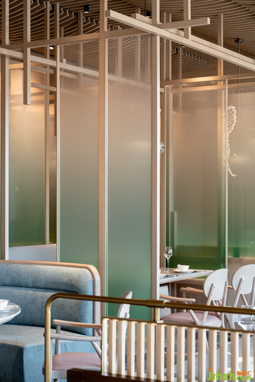 進入零點區(qū),餐廳設(shè)計師不僅在設(shè)計中將東方空間氣質(zhì)與當代視覺感受進行融合,同時也融入了“江南飛檐”、“宋畫”、“園林構(gòu)成”等淮揚人文素材,并將提取的傳統(tǒng)淮揚元素進行扁平化處理,同時使用折疊、疊加、拼貼等設(shè)計手法將抽象化元素進行重構(gòu),形成一幅全新的、當代的“淮揚長卷”。打造了零點區(qū)青蔥春日,白鶴飛舞上揚州的景象。
