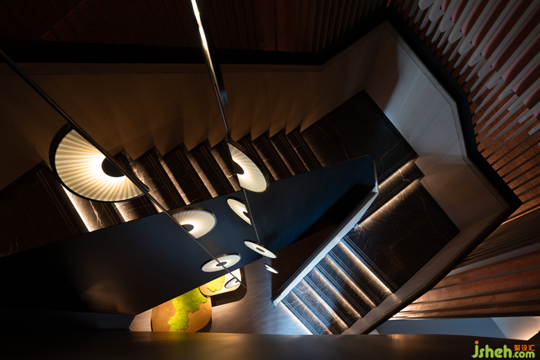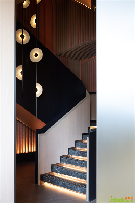 樓梯運(yùn)用黑色與木色的轉(zhuǎn)折形成幾何感十足的連接空間,宛若向上延伸的長卷,空間中心的折扇定制燈極具揚(yáng)州風(fēng)味,成為這個空間的特別存在。