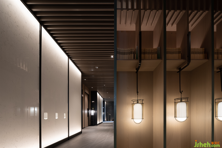 “幾百年人家無非積善,第一等好事只是讀書”,針對書香揚(yáng)州,設(shè)計師在二樓包廂走廊空間精心設(shè)置了連門書架,銅色的精致燈具放置其中,顧客需要推開一側(cè)穿插“書架”中書卷氣息的門扇方能進(jìn)入包廂中。另一側(cè)藏在和紙中的包廂仿佛置身于朦朧霧氣之中,更有一種江南之美。