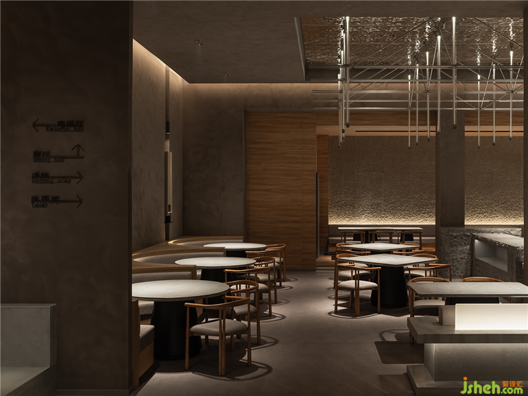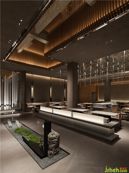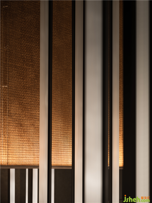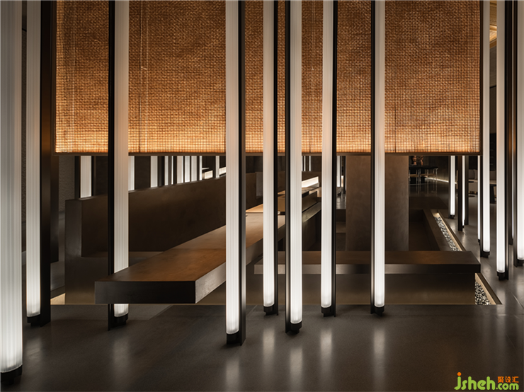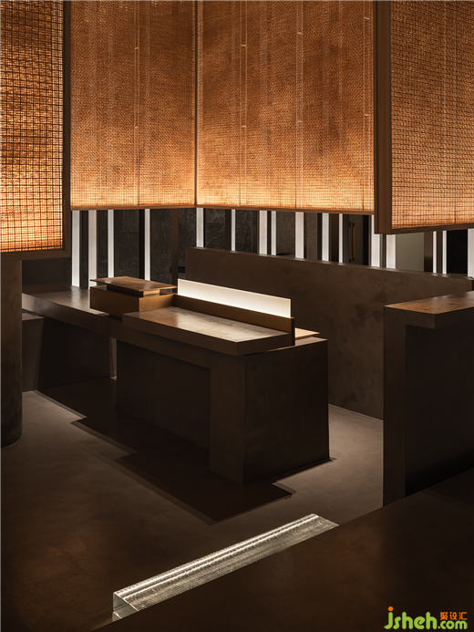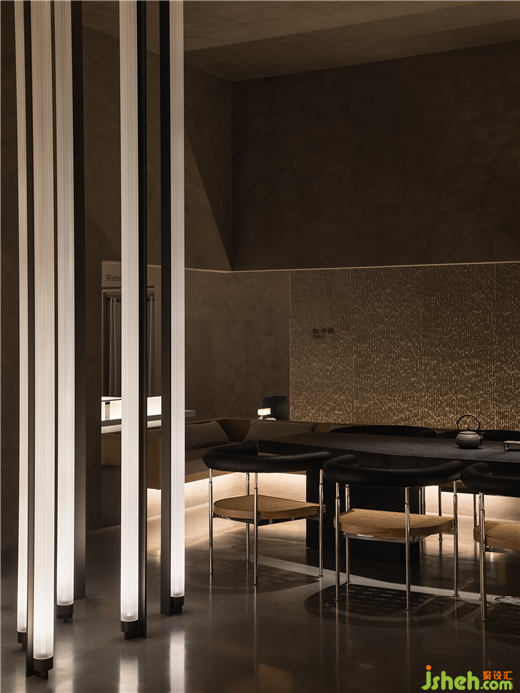 和子SPA會館設(shè)計被極致抽象的線條,是屬意當(dāng)代的克制浪漫,于縱橫間流露出文人詩意,想象力編織成圖。一切似是而非,縱貫的燈光如練如瀑,涓流借著光影在流水石上「淌過」,恰如畫中山壁上密如細(xì)雨的筆觸(雨點皴)。循級亭心,暖光如月,竹簾空懸。
