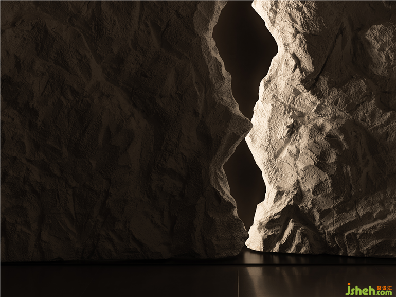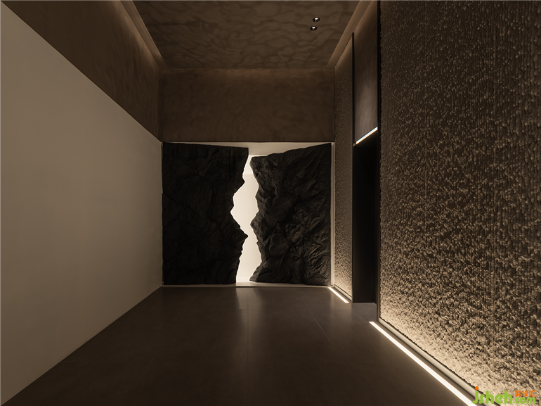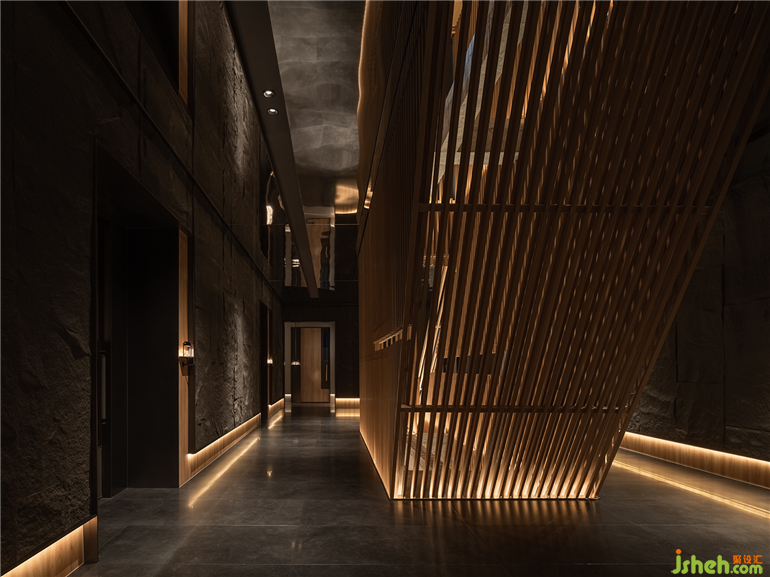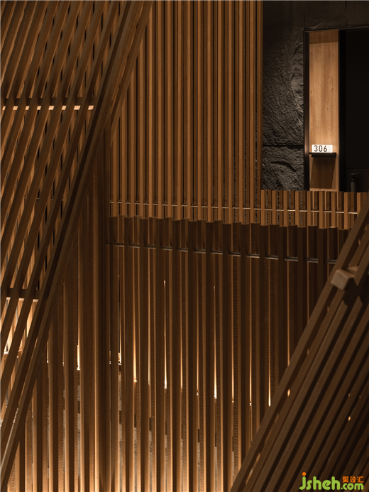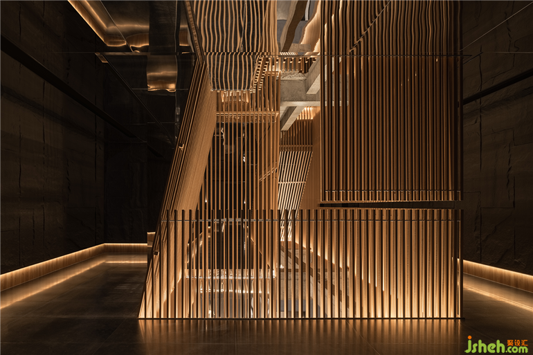 精彩的是,樓宇本身被架在層疊的「山巒」之上,將「山水」融入整個骨架,混然成勢。和子SPA會館設(shè)計密集的格柵縱貫上下,如瀑傾瀉;石構(gòu)橫穿期間,下瞰有谷,上作千仞。峰巒在抽象隱忍的設(shè)計語言中,現(xiàn)其山勢,隱其機鋒,生出全新不同的美學(xué)享受。《溪山行旅圖》仿佛被刻在基架中,成為建筑的底層邏輯。