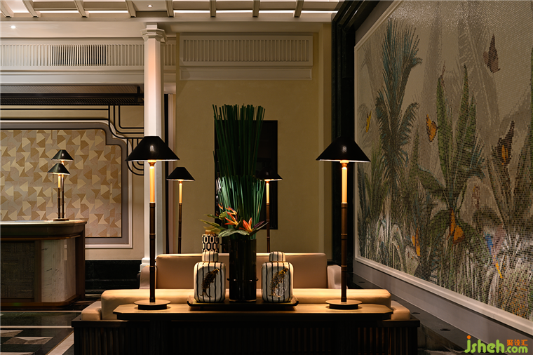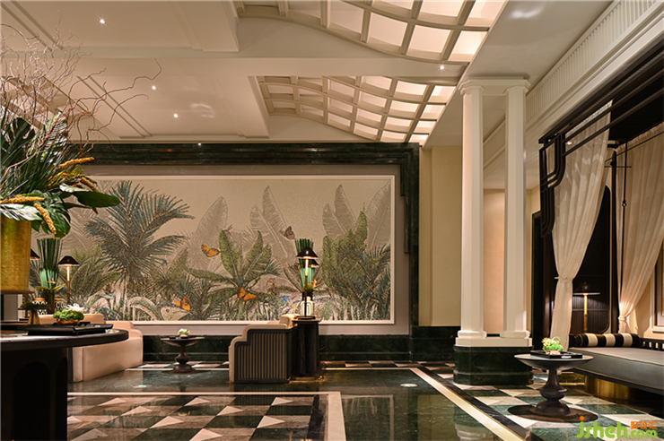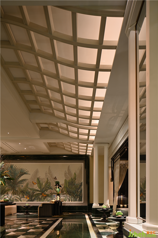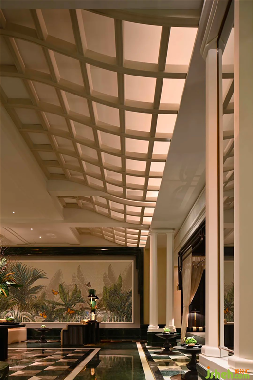 一進入大堂,人們立刻會被中央明亮的巨型玻璃穹頂所吸引。波浪型的穹頂起伏,仿佛自然界的波浪,營造出一個充滿活力和動態(tài)的氛圍?;⌒魏颓€狀的結(jié)構(gòu)將空間囊括在其中,這種獨特的南洋復古設(shè)計風格真是絕妙而令人嘆為觀止。