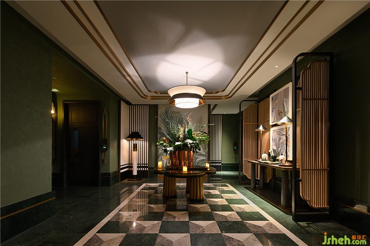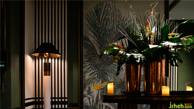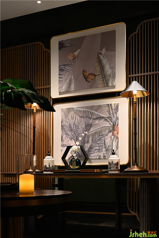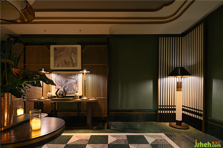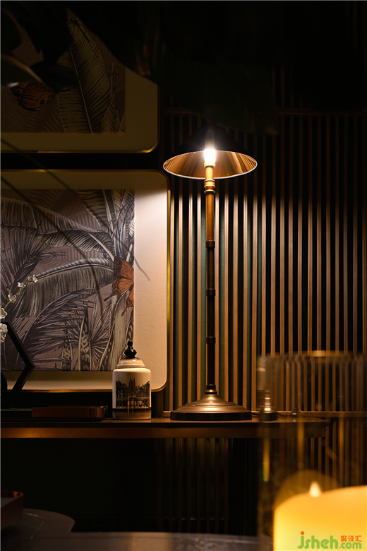 柔和的燈光沿著線條流向入口,創(chuàng)造出神秘的氛圍。格柵屏風和與南洋綠背景墻形成鮮明的對比,亮眼、治愈、復古,充滿活力和復古,燈光增強了深度和維度。兩幅小裝飾畫增添了氣氛,一切都充滿了南洋風情。
