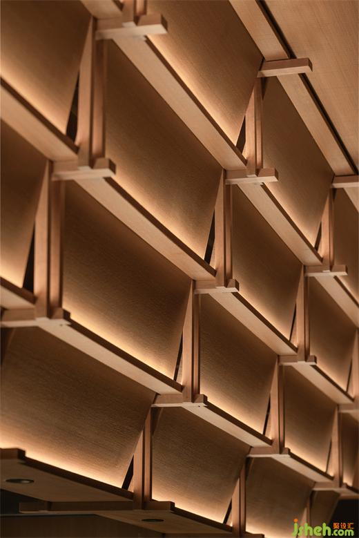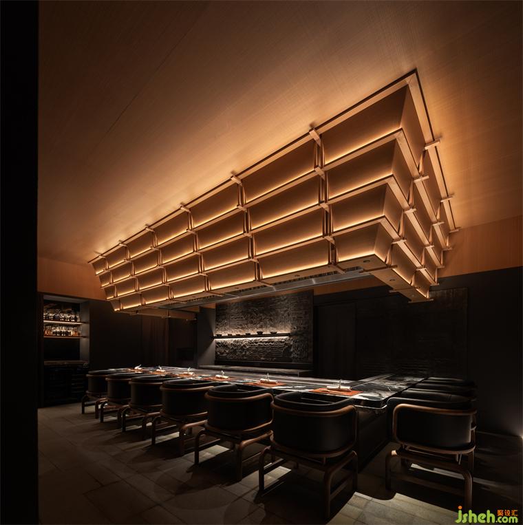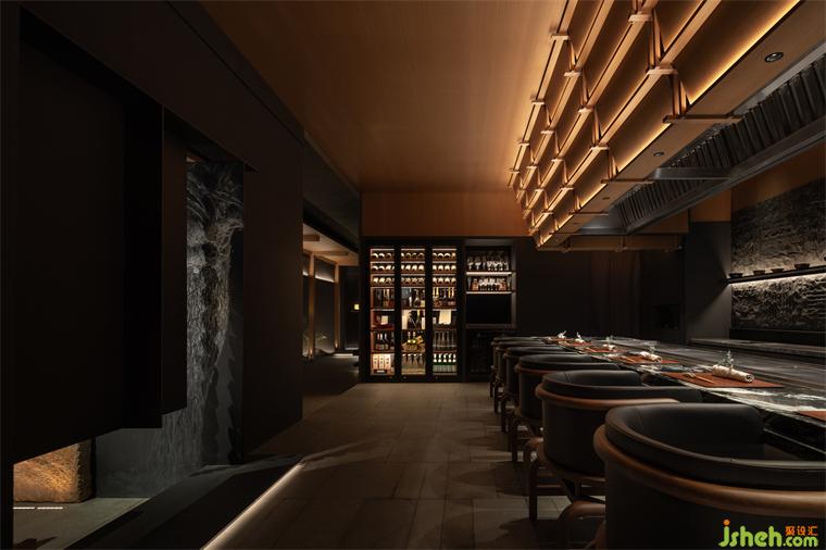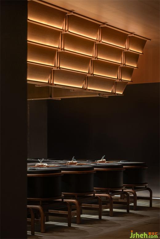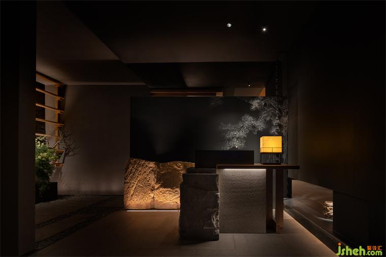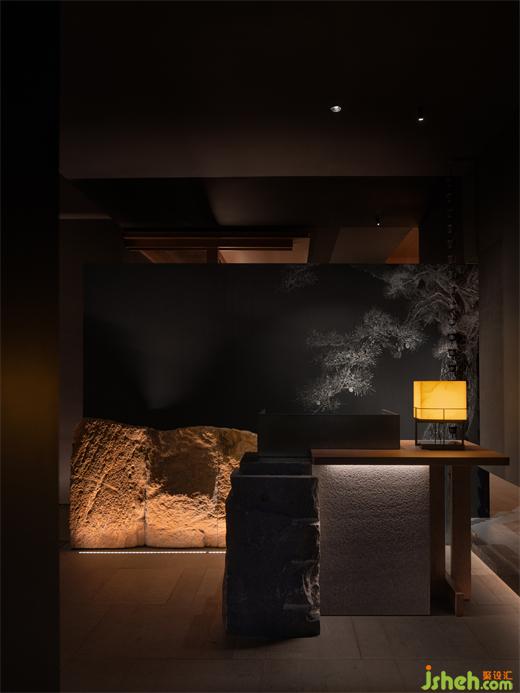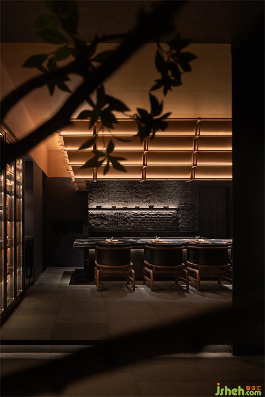 松聲靜夜聞,月光涵露重??臻g欲揚(yáng)先抑,素黑幽玄的環(huán)境中包含著對自然的敬意和縮影,雪松、巖石、明月,如在筆墨間。日料餐廳設(shè)計(jì)建筑并未寓意過多,沉寂幽玄的光影帶來的克制讓觀者將悲喜收于內(nèi),卻也牽出夢的絲線,掛于松雪之末,月隱婆娑處。