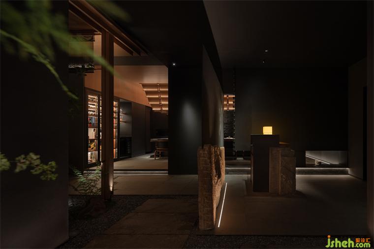 凡此種種,講究主體與客體之間反差帶來的美,如“煙生遙岸隱,月落半崖陰”,詩境中彼岸與明月何所見,只因煙生、涯陰。設(shè)計(jì)師運(yùn)用光影手法,讓感性的美走進(jìn)深邃的黑,空寂而深遠(yuǎn),如同在水墨中留以隱秘和留白,以表幽玄意境。
