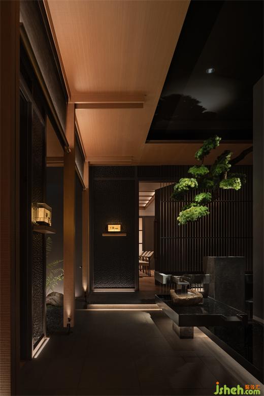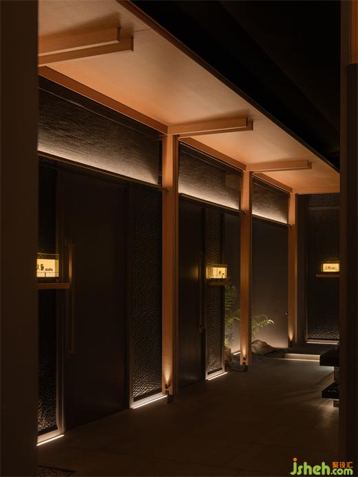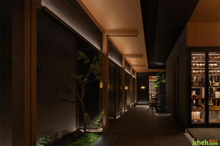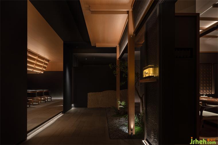 空間借鑒了日式建筑中特有的空間形態(tài)“緣側(cè)”及“連廊”結(jié)構(gòu),將包廂與十人就餐區(qū)之間的障礙破除,如置身一個向內(nèi)的帶庭院的料亭之中,小中見大,并引景入室;是空間從私密、到半私密、再到公共空間的一種層次過渡。日料餐廳設(shè)計脫胎于日本傳統(tǒng)審美,傳承盛唐的文化底蘊,也糅雜了西方現(xiàn)代派的理念,表現(xiàn)出對日常、自然的關(guān)注。