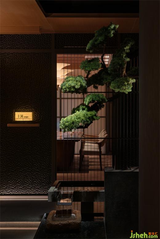 松杉斂翠陰,欄桿護(hù)新綠。庭院內(nèi)的松樹彼此呼應(yīng)著,建筑思考著與人、與自然的關(guān)系。庭院景觀中,有自然的幽玄與寂,建筑體亦是。從公共區(qū)域向包間望去,隱隱約約間,呈現(xiàn)畫意,縱橫的線條與松枝交織在一起,既透出古樸中的雅意,亦梳理出內(nèi)心的寧靜。