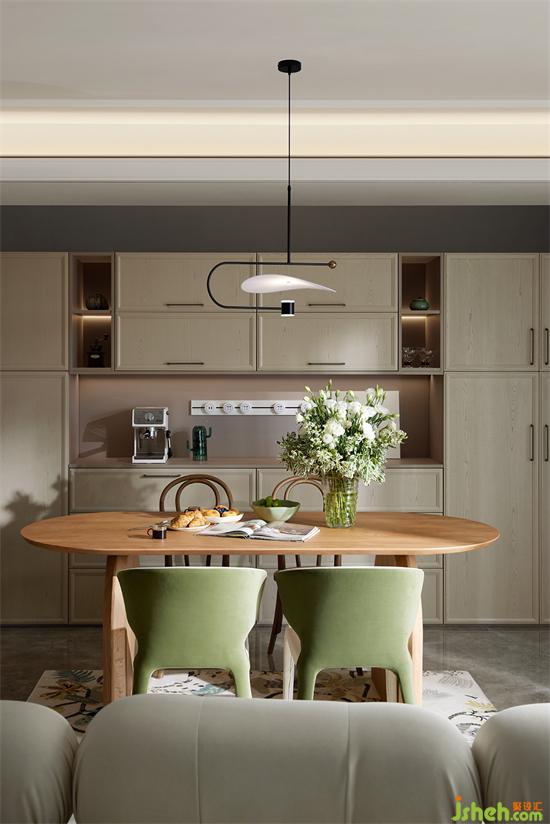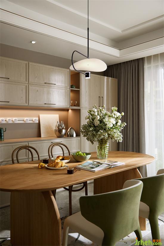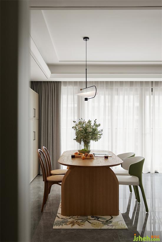 餐廳與客廳貫通,開闊通透,采光良好。家裝設(shè)計餐廳延續(xù)了原木與綠色的搭配,自然清新,桌上瓶盞中的洋桔梗,更添幾分生機(jī)畫意。