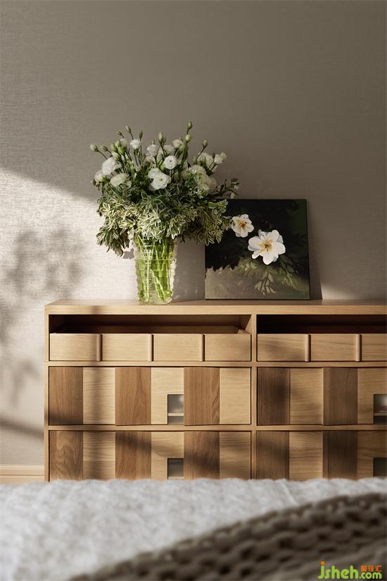 木桌上洋桔梗的芬芳與小幅丙烯版畫中相呼應(yīng),家裝設(shè)計(jì)緩緩氤氳著各自的恬淡與美好。
