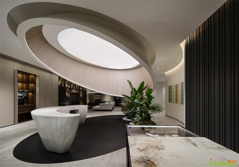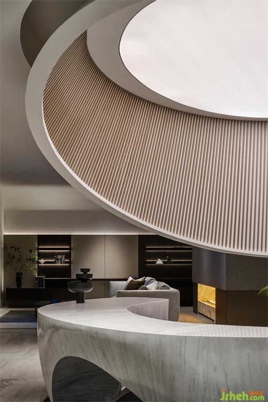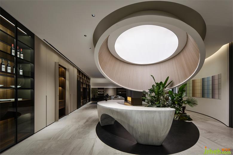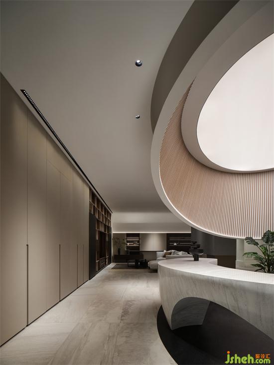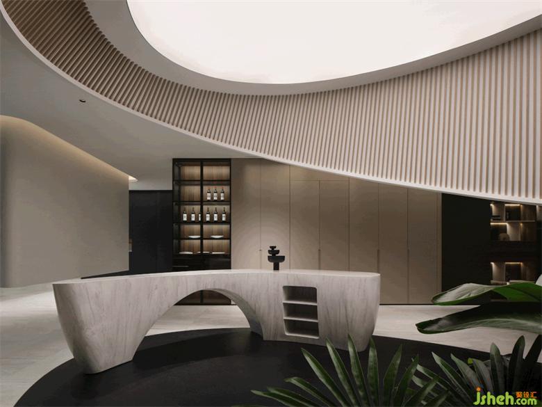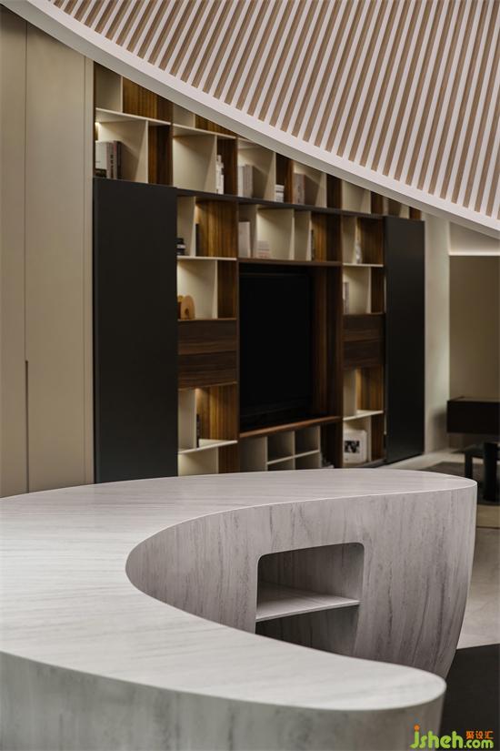弧形的島臺,盡顯曲線之美,既可以作為游覽過程中的中轉(zhuǎn)站暫歇,又呼應(yīng)空間中的其他曲線元素,營造靈動柔和的氛圍。