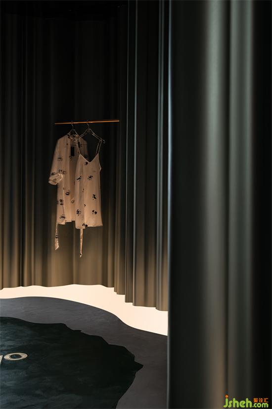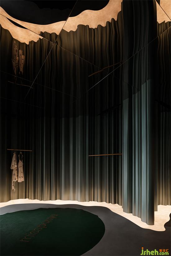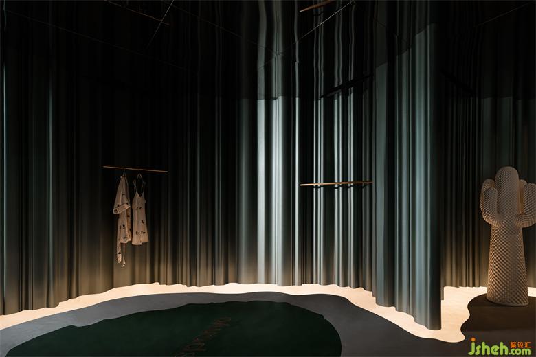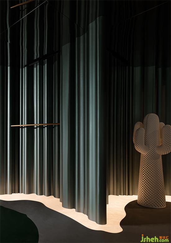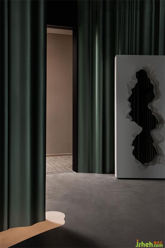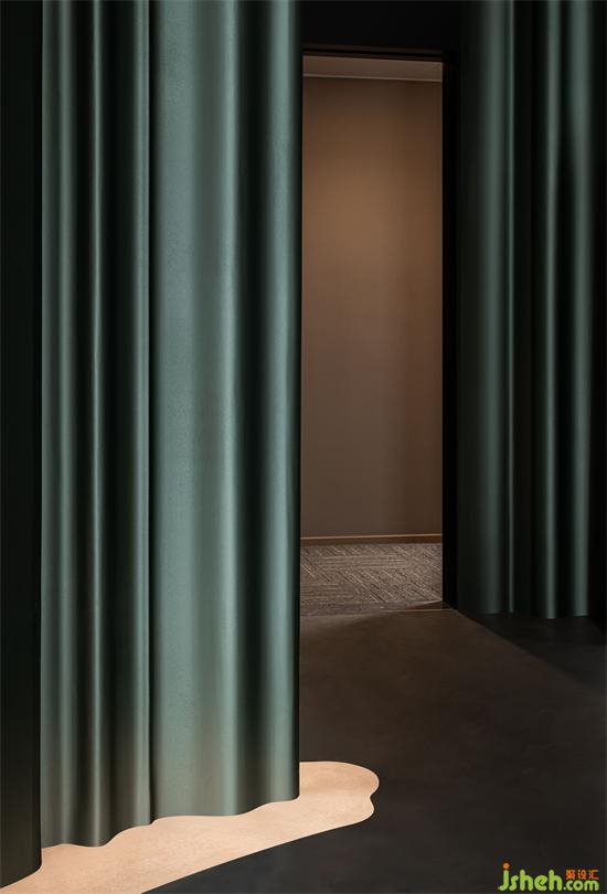 空間選用品牌的基本色墨綠色作為背景基調(diào),如瀑布般傾瀉而下的墨綠色隔墻,辦公室設(shè)計(jì)以絲綢漆模仿真絲內(nèi)衣質(zhì)感,拉開了空間的戲劇帷幕,垂墜下綠色華美流光,在地上漾起星河漣漪,自由無(wú)拘,蔓延流轉(zhuǎn)。