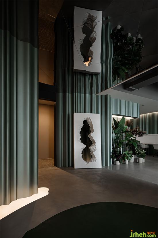 墨綠色調(diào)的暈染,夢(mèng)幻迷離,為故事的跌宕起伏埋下伏筆。辦公室設(shè)計(jì)綠瀑與燈流相映生輝,光明與晦暗交織,彼此堆疊,彼此成就。