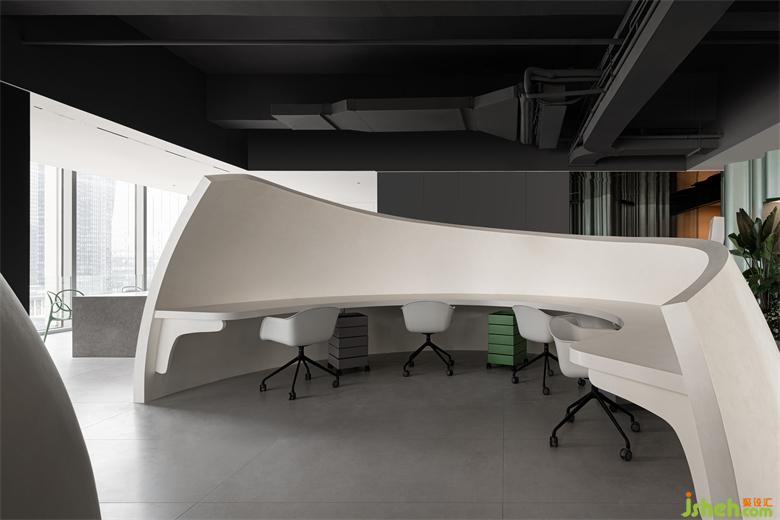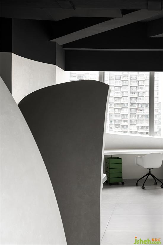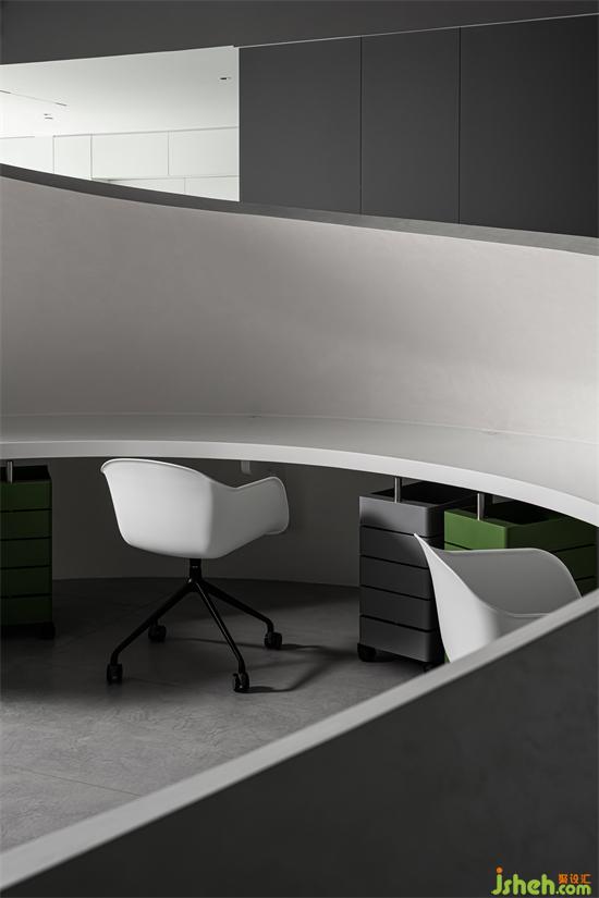 半開放的兩個圓弧形空間作為員工日常的辦公區(qū)域,彼此之間互相隔開,使得不同工位之間互不影響,保障員工安心辦公。