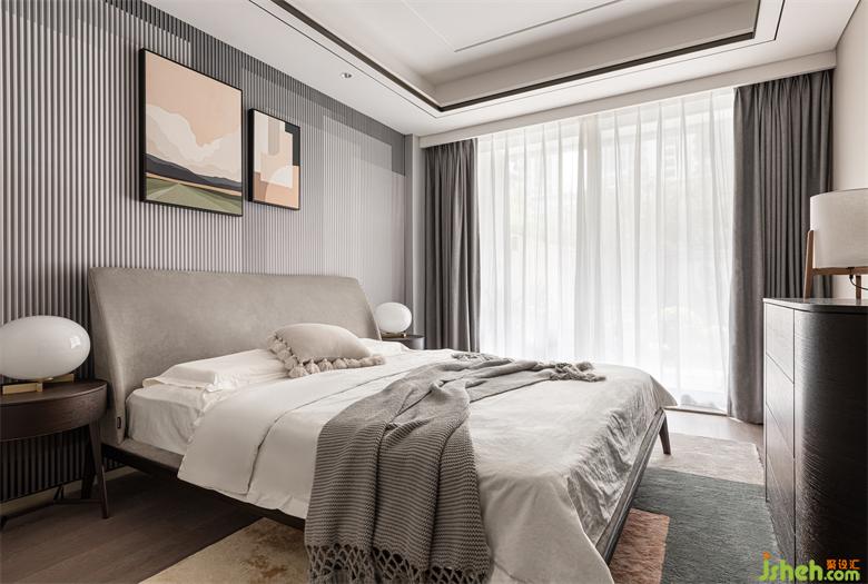 次臥色調(diào)靜謐柔和,裝飾藝術(shù)版畫,使空間變得更加生動多姿,別墅設(shè)計營造出一種適于休憩的沉靜氛圍。