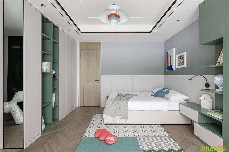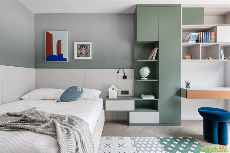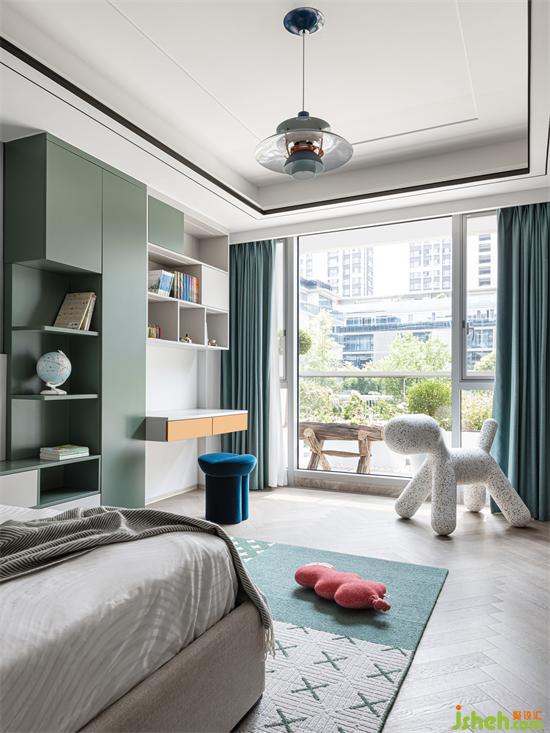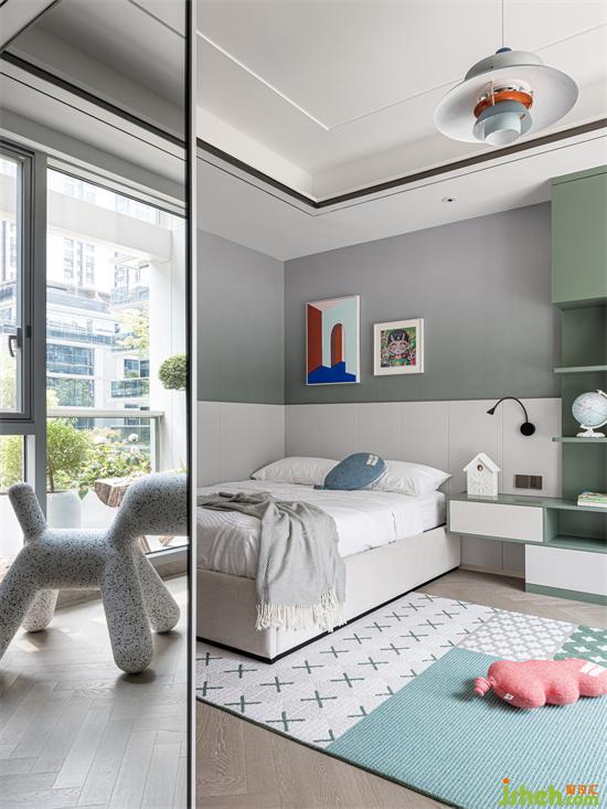 兒子房以柔和的綠色調(diào)為主,清新自然,充滿生機與活力。別墅設(shè)計空間中充足的柜體收納,滿足孩子成長過程中的各類收納需求。