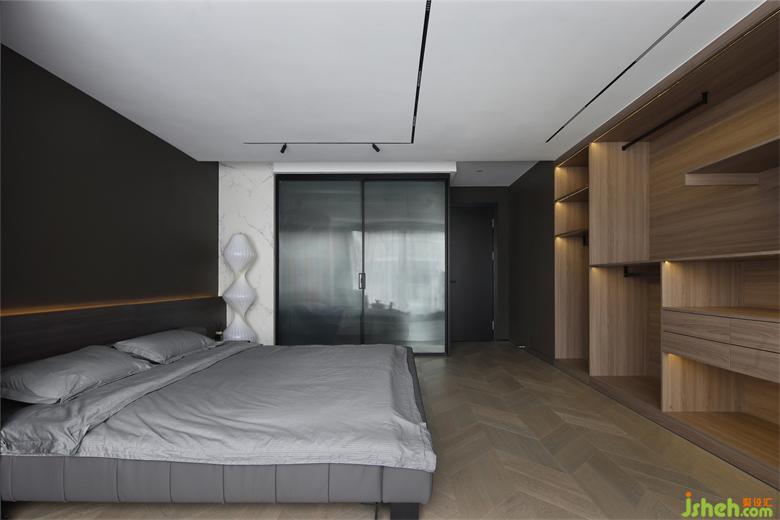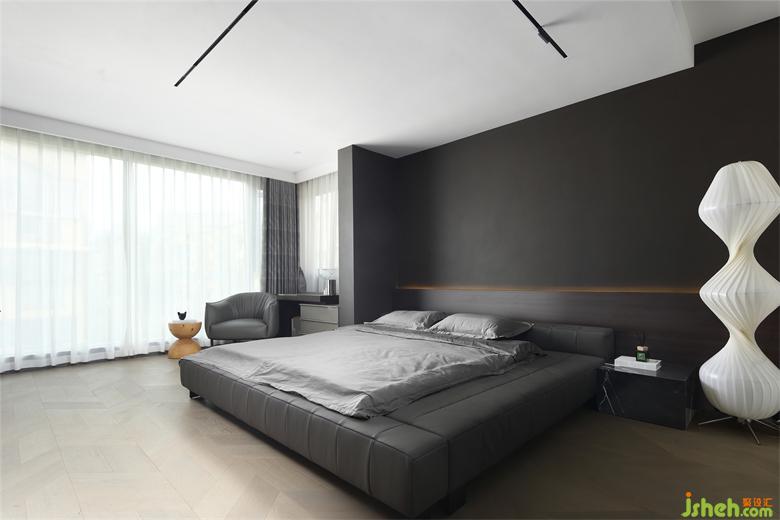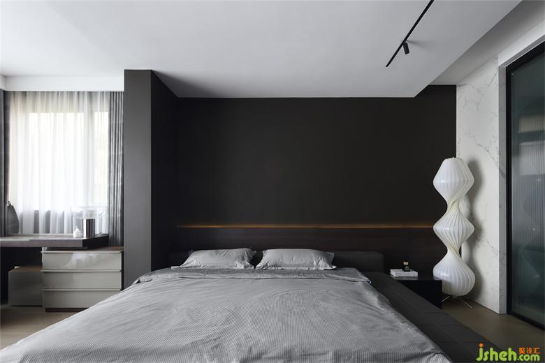 主臥依舊延續(xù)了空間的黑灰色主調(diào),營(yíng)造出沉穩(wěn)靜謐的休憩氛圍,飾有螺旋紋路的白色落地?zé)糇鳛橐荒辽?,使空間不至過于昏暗。