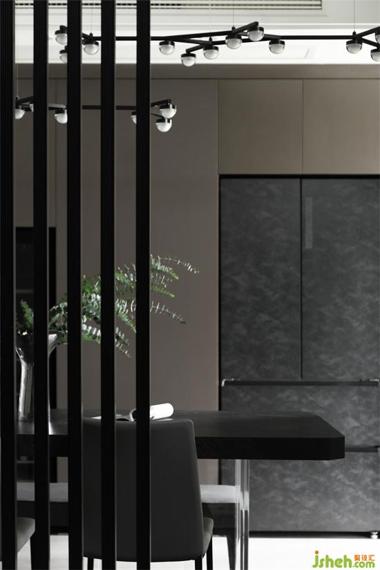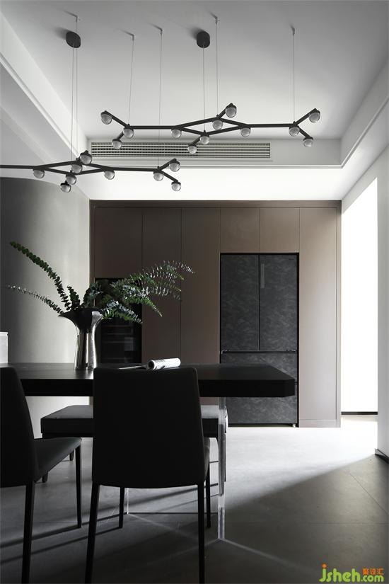深色的餐桌椅,簡雅質(zhì)感,增加了用餐時的儀式感。家裝設(shè)計枝丫形吊燈利用堅韌硬朗的線條勾勒出空間的脈絡(luò)。