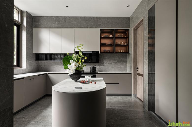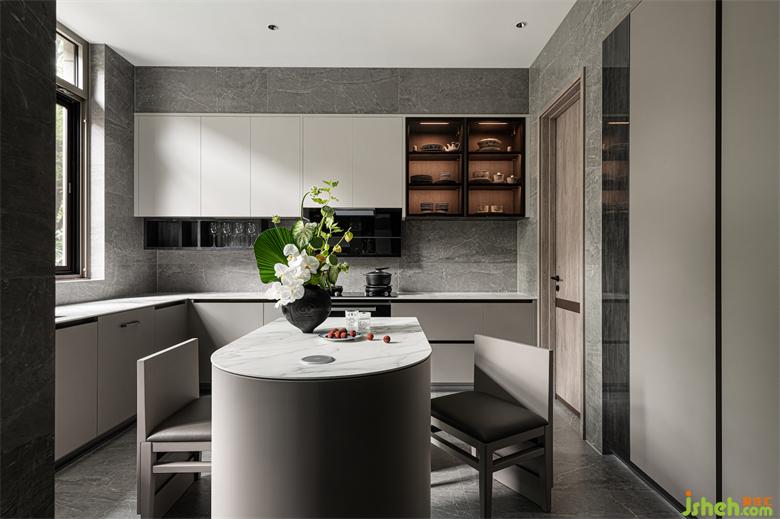 夫婦二人對(duì)廚房有著自己的理解,根據(jù)自身多年的生活習(xí)慣和生活經(jīng)驗(yàn),他們很少到外面吃飯,并不喜歡偏于形式化的西廚,而鐘愛(ài)于大氣開(kāi)闊、實(shí)用性更強(qiáng)的中廚。為了滿足夫婦對(duì)廚房的高要求,設(shè)計(jì)師將原有的狹小空間予以拓寬,做了大氣寬敞的中廚。別墅設(shè)計(jì)大玻璃窗設(shè)計(jì),讓廚房擁有著良好的通風(fēng)與采光。中間的島臺(tái)平時(shí)可以作為一張小餐桌,滿足四人日常的家庭用餐。