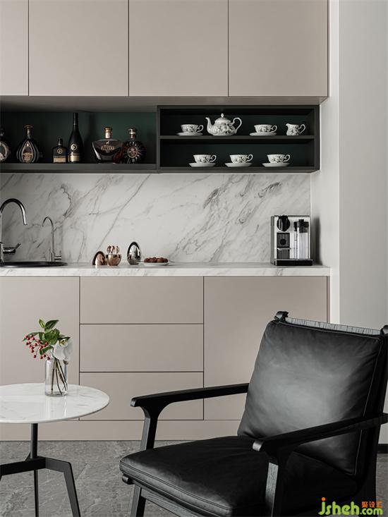 水吧區(qū)利用簡練明快的線條勾勒出整個場域,這里收納有序,茶酒皆備,是平日生活中歇腳的溫馨驛站。