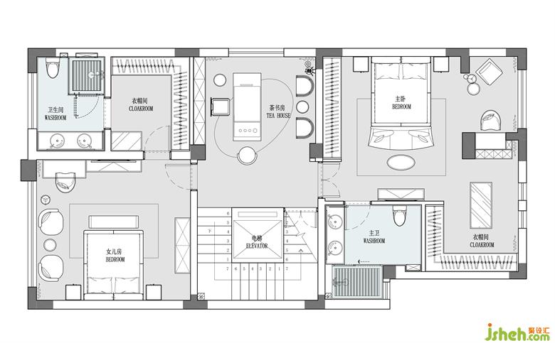 三樓設(shè)計(jì)了兩個(gè)套房:主臥套房和女兒套房。中間有一個(gè)茶書(shū)房,供閑時(shí)閱讀品茗,同時(shí)滿足夫婦二人的交流需求。