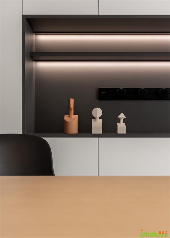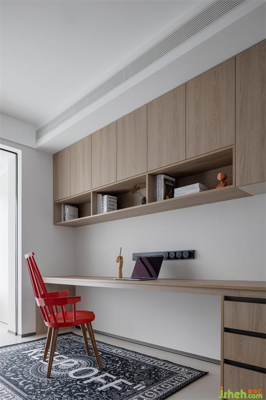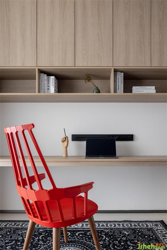 書房設(shè)置吊柜進行收納,簡單整潔。沉靜的木色營造出安靜的工作學習氛圍。家裝設(shè)計紅色的座椅,充滿讓人醒目的熱情,使整個空間活力十足。