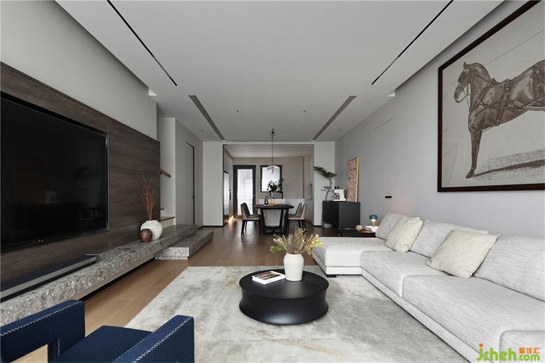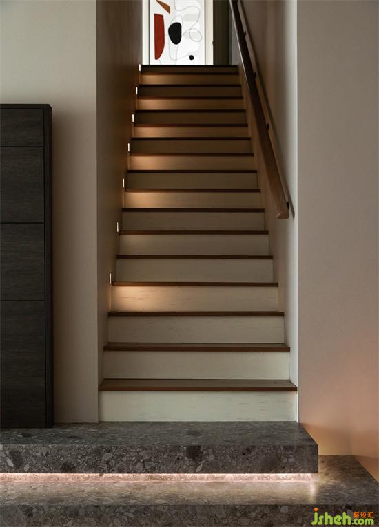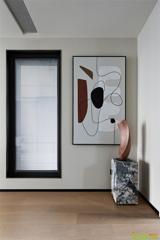 樓梯將空間劃分為樓下的社交休閑空間和樓上的私人休息空間,公私空間有著明確的區(qū)分,互不干擾。抽象版畫,麓湖蕓臺(tái)漫躍層裝修設(shè)計(jì)以極簡線條與圖形的碰撞,呼應(yīng)了整個(gè)空間的設(shè)計(jì)調(diào)性。