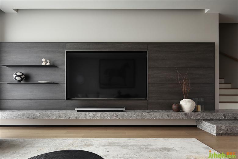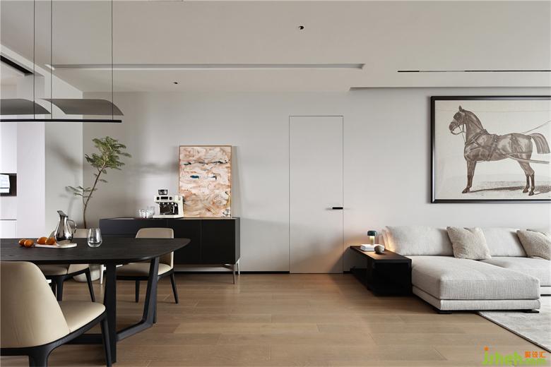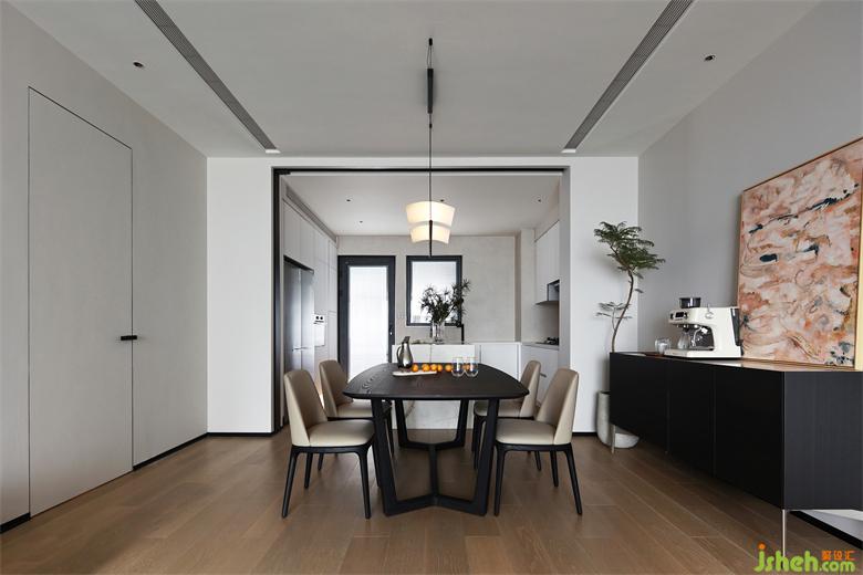 餐邊柜上的藝術(shù)版畫用斑駁的橙色為空間帶了一抹亮色,活潑生動(dòng),麓湖蕓臺(tái)漫躍層裝修設(shè)計(jì)中和了原有黑白空間的嚴(yán)肅感。隱形門的設(shè)置,讓整個(gè)空間看上去更加整潔干凈。