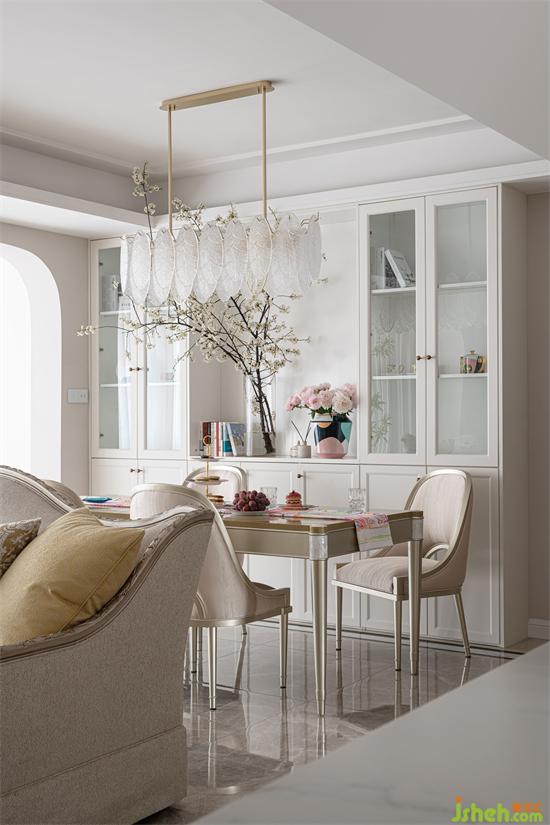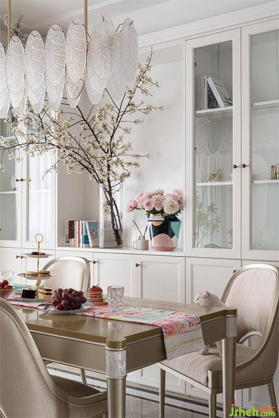 餐廳的布置依舊延續(xù)整個(gè)空間的浪漫格調(diào),成都遠(yuǎn)洋萬和公館裝修設(shè)計(jì)以弧形元素增加雅致感,選用與客廳相呼應(yīng)的花瓣形吊燈,脈絡(luò)分明,頗具精雅質(zhì)感。