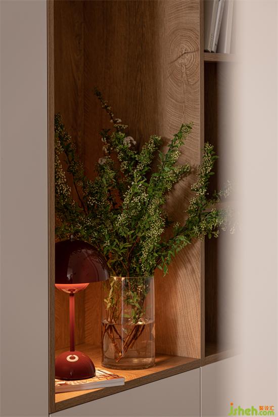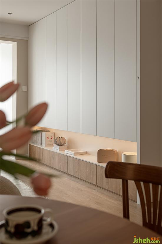 入門玄關處以蔥郁瓶盞做裝飾,在昏黃光線的氤氳下,別具溫馨質(zhì)感。成都家裝設計木質(zhì)紋路漾開一圈圈“漣漪”,輕輕訴說著時光的柔靜與恬淡。