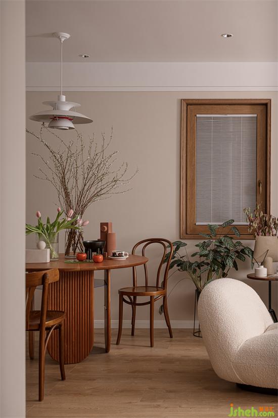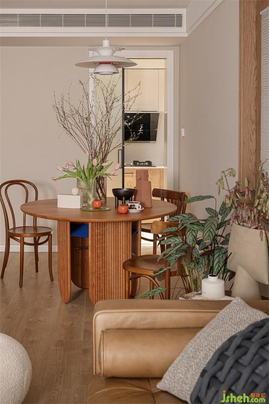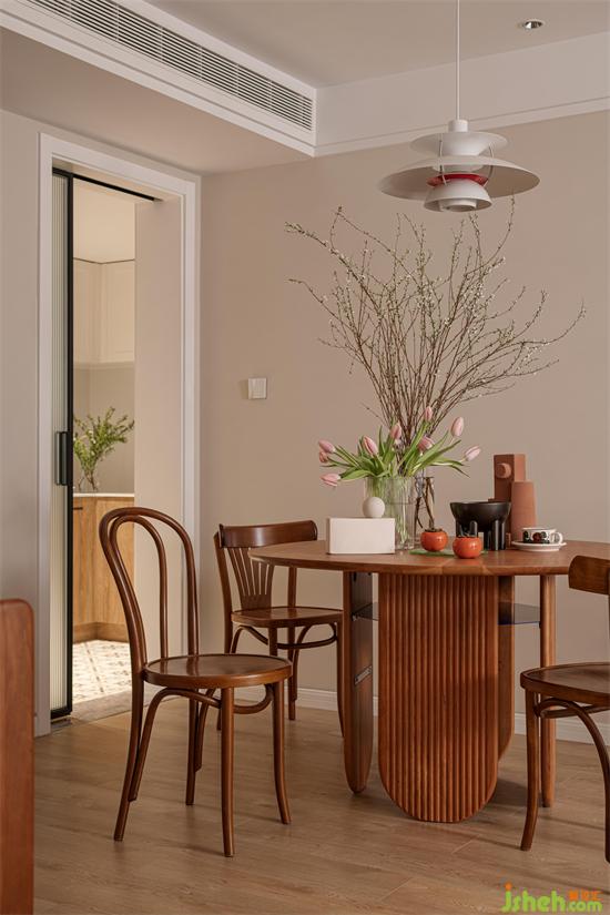 餐廳延續(xù)空間的木質(zhì)元素,成都家裝設計獨特的餐桌,底部圍繞有弧形桌腿,上面飾有細密紋路,做工考究,獨特之余,又頗有質(zhì)感,靠背餐椅的弧形線條與之呼應,自然優(yōu)雅。
