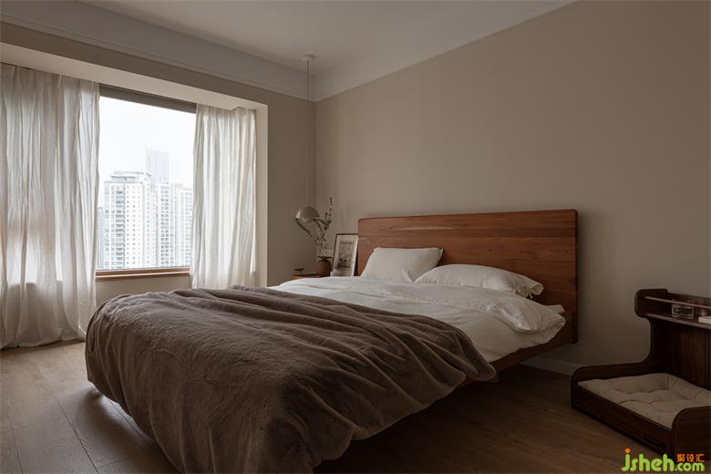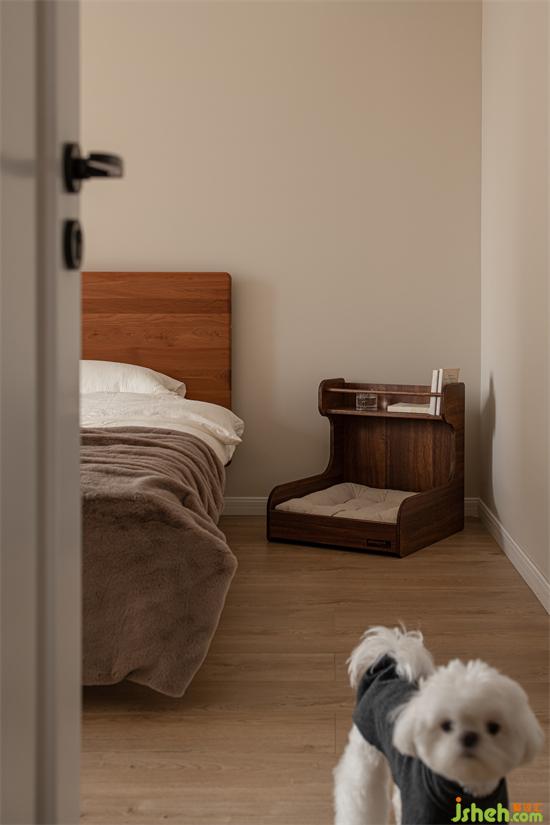 主臥采光通風良好,選用沉穩(wěn)的木色,營造舒適安靜的休憩氛圍,同時,也與整個家的自然氣質(zhì)相呼應。成都家裝設計將狗狗木床放置在室內(nèi),方便平時照料。