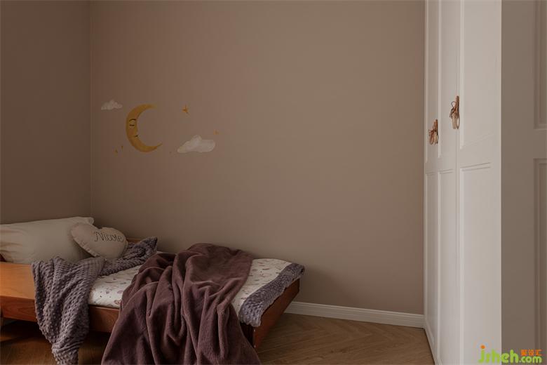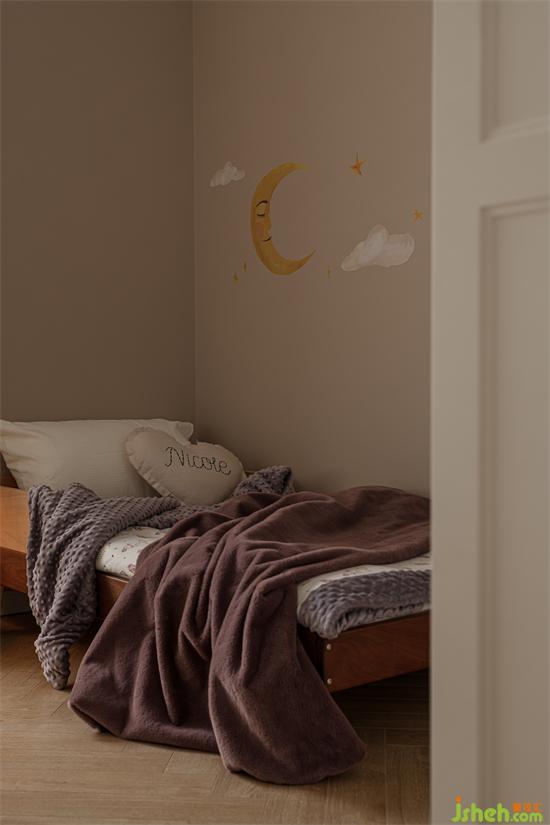 女兒房用色柔和雅靜。墻壁上的月亮與云朵圖案天真俏皮,沉靜之外,充滿浪漫的想象力,與女兒的年齡愛好相符。