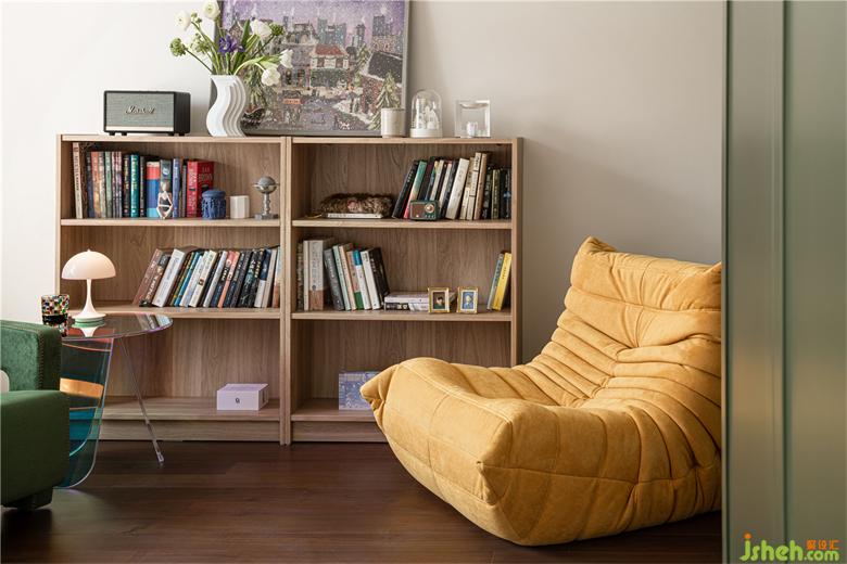 書房墻壁使用乳膠漆刷出的淺銀灰色作為背景,與木色矮柜相搭配,質(zhì)樸文藝。木作柜門跟隱形門同色,柜門的把手特意選了跟隱形門把手相似的銀色橢圓把手。