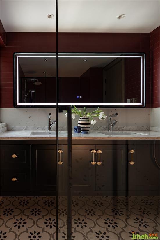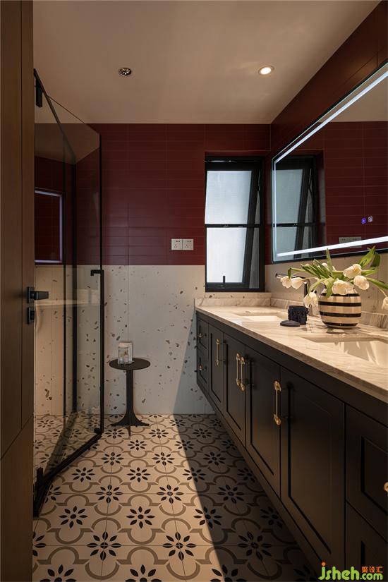 設(shè)計師將主衛(wèi)進行了重新的設(shè)計改造,顏色選用大膽的復(fù)古紅,奶油小法式家裝設(shè)計以水磨石元素增加自然質(zhì)樸之感,家裝設(shè)計以小復(fù)古花磚營造出活潑典雅的格調(diào)。