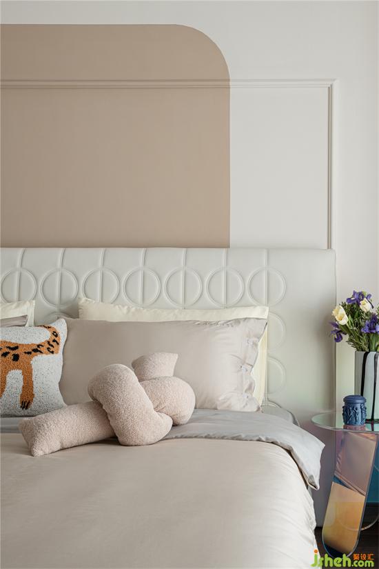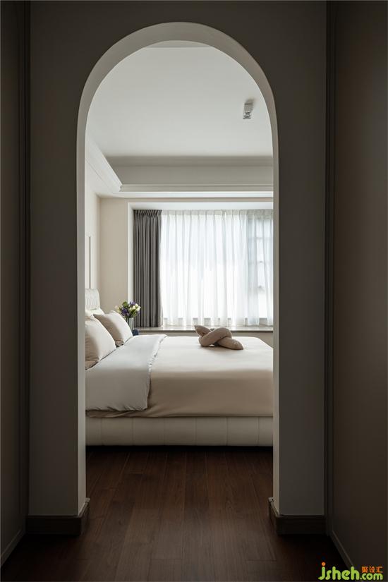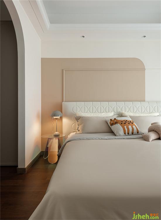 奶油小法式家裝設(shè)計師將主臥原有裝飾面予以拆除,利用線條與乳膠漆進行背景分色。家裝設(shè)計同時,把衣帽間的門洞改成拱形門洞,邊頂增加石膏線條,精致細(xì)膩,增加儀式感。