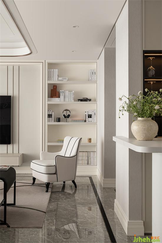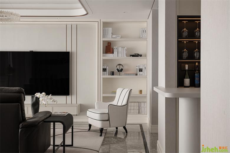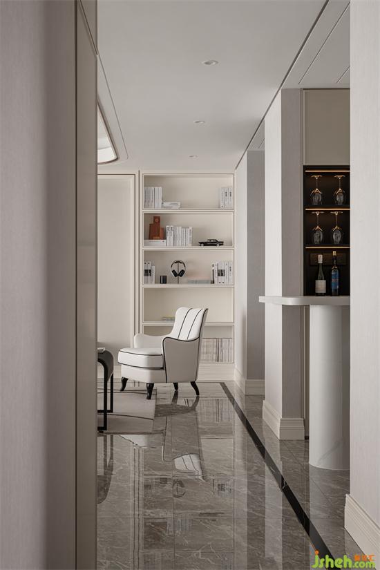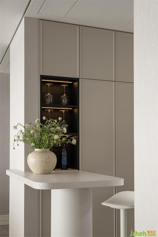 設(shè)計師在空間中設(shè)置了一個專門的小型水吧臺,對空間功能進(jìn)行拓展的同時,成都中鐵御花府家裝設(shè)計讓整個空間看上去更富于層次。水吧臺延續(xù)空間的白色主調(diào),清新雅觀,開辟出一處理想的互動休閑空間。這里既可以作為用餐區(qū)、娛樂區(qū),還可以作為工作區(qū),供家庭成員在輕松的環(huán)境中完成家庭辦公或?qū)W習(xí)任務(wù)。